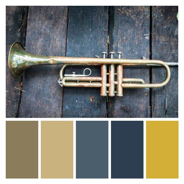 A timeless palette inspired by the weathered beauty of a vintage brass trumpet. The rich, golden hues of polished and tarnished brass are complemented by the deep, cool tones of aged wood, creating a harmonious balance between warm and cool. This palette evokes a sense of nostalgia, musical heritage, and timeless elegance. It's perfect for jazz club branding, vintage-inspired interiors, or classic menswear design. The muted gold tones paired with deep navy create a sophisticated and luxurious feel, ideal for upscale restaurants, boutique hotels, or high-end packaging design. This color scheme would also work beautifully in autumn-themed projects or for businesses wanting to convey a sense of tradition and craftsmanship.