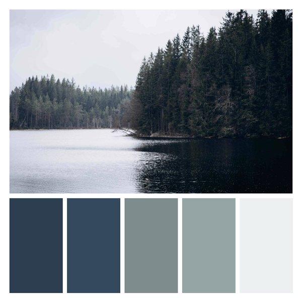 A serene and atmospheric palette inspired by a tranquil lakeside scene at dawn.
